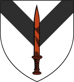 A copper dagger across a black chevron, on a white field (Argent, a chevron reversed sable, surmounted by a dagger erect tenné) |