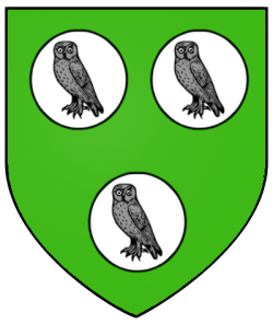 Three grey owls upon white plates, on a green field (Vert, three plates, each charged with an owl close affronté cendrée) |