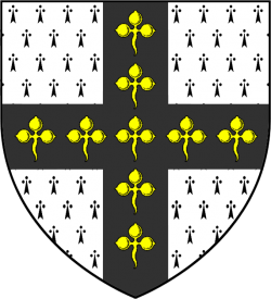 Nine yellow trefoils on a black cross, on an ermine field (Ermine, on a cross sable nine trefoils or) |