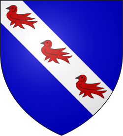 Three red martlets on a white bend, on a blue field (Azure, on a bend argent three martlets gules) |