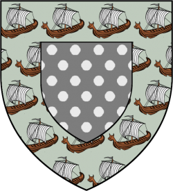 An iron escutcheon with silver studs on a grey-green field strewn with longships proper (Vert-cendrée semé of longships proper, an escutcheon cendrée platé) |
