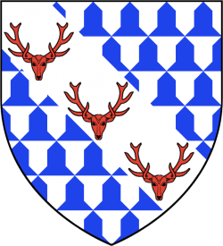 Three red hart's heads caboshed on a white bend on vair (Vair, on a bend argent three harts’ heads caboshed gules) |
