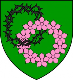 A ring of black thorns and a ring of pink flowers, interlocked, on a green field (Vert, an annulet of thorns sable embracing another of flowers rose) |