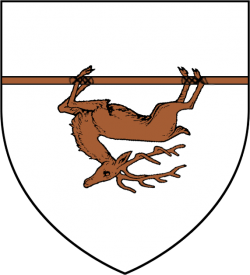 A brown deer, bound and slung on a pole, on white (Argent, on a pole fesswise proper a deer bound and slung brunâtre) |