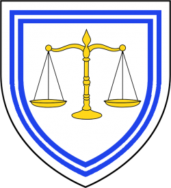 Golden scales within a blue a double tressure, on a white field (Argent, a pair of balances or within a double-tressure azure) |