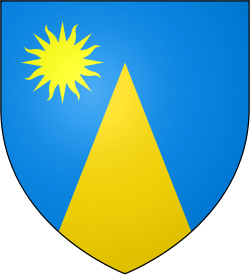 A golden inverted pile on a sky-blue field, a yellow sun in the first (Bleu celeste, a pile reversed or, in canton a sun-in-splendor of the same) |