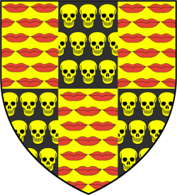 Quartered of six: red lips strewn on a yellow field, yellow skulls strewn on a black field (Quarterly of six, first, third and fifth, or, semé of lips gules, second, fourth and sixth, sable, semé of skulls of the first) |