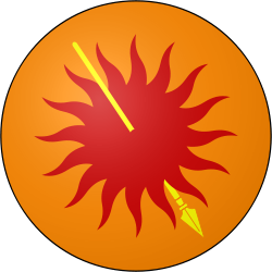 A gold spear piercing a red sun on an orange field (Tenné, a sun-in-splendour gules transfixed by a spear or) |