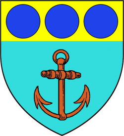 A rusty anchor, on a turquoise field, beneath yellow chief with three blue plates (Aquamarine, an anchor rusted proper, on a chief or three hurts) |