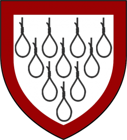 10 nooses, 4-3-2-1, black on white with a border of blood (Argent, ten nooses 4-3-2-1 sable within a bordure sanguine) |