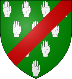 Ten white hands on green, 4-3-2-1, beneath a red bend sinister (Vert, 10 hands 4-3-2-1 argent debruised by a bend sinister gules) |
