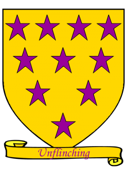 Ten purple stars, on a yellow field (Or, ten mullets, 4, 3, 2, 1, purpure) |