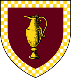 A golden flagon on burgundy within a border of gold and white checks (Murrey, a flagon or within a bordure chequy of the second and argent) |