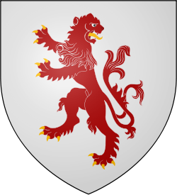 A red lion rampant regardant with a forked tail, with gold tongue and claws, on a silver field (Argent, a lion rampant regardant queue-fourché gules, armed and langued or) |