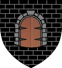 An oaken door banded with iron, in a grey stone doorway, on black masonry (Sable masoned proper, an door brunâtre banded cendrée within a stone doorway of the last) |