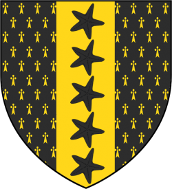 Five black starfish on a gold pale, on a field of pean (Pean, on a pale or five starfish sable) |