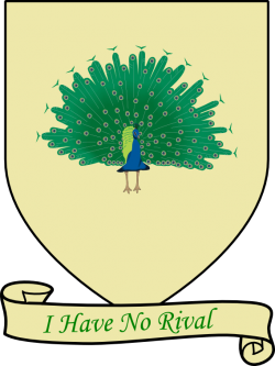 They blazon their arms with a peacock in his pride on cream.[2][3] Their words according to semi-canon sources are "I Have No Rival".[4]
