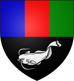 Per fesse, a divided blue, red, green field above, a white catfish on a black field below (Per fesse, the first tierced in pale azure, gules and vert, the second sable, a catfish argent) |