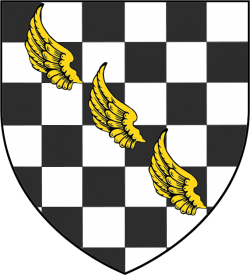 Three golden wings, bendwise, on a checkered white and black field (Chequy argent and sable, in bend three dexter wings elevated bendwise or) |