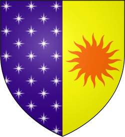 Per pale, white stars strewn on indigo, an orange sun on yellow (Per pale, in dexter purpure semé of mullets argent, in sinister or, a sun-in-splendour tenné) |