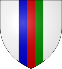 A tripartite pale, blue, red, and green, on a white field (Argent, a pale tierced per pale azure, gules, and vert) |