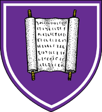 A white scroll with gold knobs, on a purple field within a white tressure (Purpure a scroll argent, knobbed or, within a tressure of the second) |