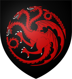 House Targaryen is a noble family of Valyrian descent who once ruled the Seven Kingdoms of Westeros. The Targaryen sigil is a three-headed dragon breathing flames, red on black.[1][2][3] The house words are "Fire and Blood".[4]