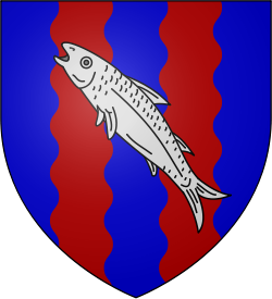A leaping silver trout on a field of blue and mud red (Paly wavy azure and gules, a trout embowed argent) |