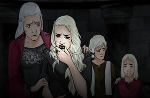 Aethan's daughter, Alyssa, was married to Prince Aenys Targaryen, heir to the throne, in 22 ᴀᴄ, with whom she had six children (Rhaena, Aegon, Viserys, Jaehaerys, Alysanne, and Vaella).[11] Alyssa became queen at her husband's coronation. She outlived Aenys I and became a prisoner of his brother, Maegor I Targaryen, on Dragonstone, when Maegor claimed the throne over Aenys's sons by Alyssa. In 44 ᴀᴄ Alyssa fled in the confusion that followed the death of Dowager Queen Visenya Targaryen. Her last surviving son by Aenys, Jaehaerys, put forward his claim for the throne. Lord Daemon Velaryon, Maegor's admiral of the fleet, who had previously supported Maegor, turned against the cruel king, and many of the great houses of Westeros joined with him.[13]