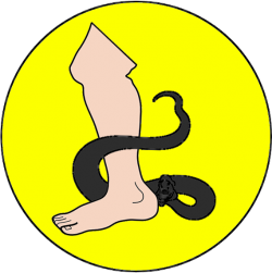 A black adder biting a heel on yellow (Or, a human heel proper being bitten by an adder sable) |