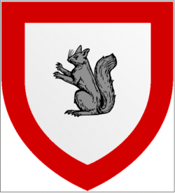 A grey squirrel on white with red border (Argent, a squirrel argent within a bordure gules) |