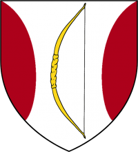 A golden longbow between two crimson flaunches, on a white field (Argent, a longbow or between two flaunches gules) |