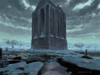 The House of the Undying is a grey and ancient ruin. It is long and low, without towers or windows and is coiled like a stone serpent through a grove of black-barked trees with inky blue leaves which are used to make the drink that the Qartheen call "shade of the evening". No other buildings stand near. Black tiles cover the palace roof, many of them fallen or broken. The mortar between the stones is dry and crumbling.[2]