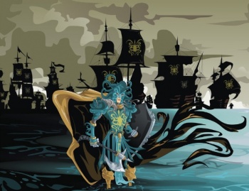 Meanwhile, the 93 remaining ships of the Iron Fleet sets sail for Essos from the Shield Islands. During the voyage they capture a merchant ship, the Noble Lady, taking its cargo and adding the ship to the fleet. In the Redwyne Straits and along the Dornish coast they capture five other ships—three cogs, a galleas and a galley—making the Iron Fleet number ninety-nine. After taking on supplies at the Stepstones, Victarion splits the fleet into three squadrons and sails for Slaver's Bay, with the squadrons to reunite at the Isle of Cedars. At Volantis Victarion learns that the Volantene fleet will soon sail against Daenerys. The Lord Captain orders his squadron to set sail immediately after they purchase food and water.[2]