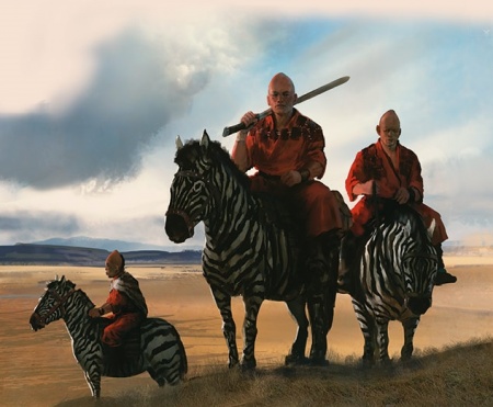 Even the Golden Empire of Yi Ti have been target of the Jogos Nhai depredations. Raids into the empire are a way of life for the zorse-riders, and a source of the gold and gems that decor the arms and necks of moonsingers and jhats as well as of the slaves that serve them and tend their herds. Over the past two thousand years, YiTish cities, towns, farms, and fields beyond count have been reduced to ruins and ashes. Many imperial generals and three God-Emperors have led armies to bring the nomads to heel but have seldom ended well and soon the raids began anew, even when jhats were compelled to vow eternal fealty to the God-Emperor and foreswear raiding forever.[2]