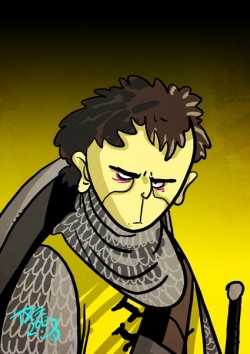 According to the story Chiswyck tells, Joss was part of Gregor's party returning from the tourney when an overflowing river detoured the group to a nearby alehouse. There Gregor proceeded to rape the innkeep's daughter while Raff the Sweetling killed his son. Joss eventually raped the young girl too.[1]