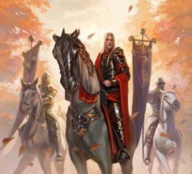Jon leads a quarter of the available strength in reclaiming Griffin's Roost, House Connington's ancestral seat, which he once held before being exiled.[2] Ser Tristan Rivers and Laswell Peake, each with comparable forces, take Crow's Nest[3] and Rain House,[4] respectively. The final quarter encamps at the arrival site under Gorys Edoryen to protect Aegon Targaryen and await stragglers. Marq Mandrake leads five hundred men from other ships in taking Greenstone on Estermont.[2] In order to confuse the Iron Throne, the sellsword commanders are instructed not to show their banners. Jon Connington intends to first seem like he merely intends to take back his lands to create uncertainty.