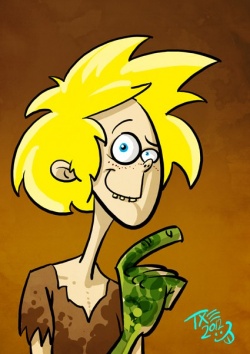 Lommy's arms are mottled green to the elbows. When he laughs, he brays like a donkey.[2] He usually talks a lot, including during meals.[4]