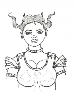 Malazza is short, with a thick waist and heavy bosom. She wears a sculpted black steel breastplate inlaid with gold, showing a harpy rising with chains dangling from her claws.[4]