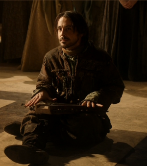 In Game of Thrones Marillion is present when Catelyn captures Tyrion[11] and accompanies them to the Vale.[12] By the end of the first season, he is at the court of Joffrey Baratheon. Marillion has been brought for the king for singing a mocking song about Robert Baratheon. In it he insinuates that the Lannisters are involved in Robert's demise. For this Joffrey sentences him to choose between losing his fingers or his tongue. Marillion does not make a choice and begs for mercy. This is to no avail and his tongue is cut from his mouth by Ilyn Payne.[13] In the books, this happens to an unnamed tavern singer.[14]