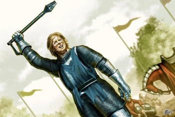 Having been crowned at Highgarden, Renly Baratheon travels with his supporters through the Reach toward King's Landing, which is held by his nephew, King Joffrey Baratheon. Renly holds a melee beneath the castle of Bitterbridge along the way. Catelyn Tully, an envoy of her son Robb Stark, notices much of the Reach's chivalry near the castle, while across the Mander are the lords from the Stormlands. While there are 116 competitors at the start of the melee, there are fewer than 20 knights remaining when Catelyn's party arrives. Brienne of Tarth singles out some men for having bet on who could claim her maidenhead. The melee continues until only two contestants are left, Brienne with a morningstar and Ser Loras Tyrell of Renly's Rainbow Guard with a longaxe. Loras yields to Brienne after being grappled to the ground, which a drunken Tyrell archer considers a vile trick. For her reward, Renly agrees to name Brienne to his Rainbow Guard.[1][2]