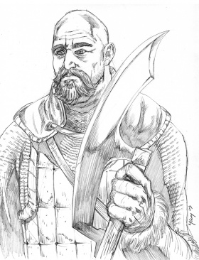 Morgan is a big, bearded, bald man. He wears a byrnie of patched and rusted mail.[2]