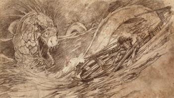 According to the ironborn legend, Nagga was the first sea dragon, able to feed on krakens and leviathans and drown islands when angry. The Grey King, helped by the Drowned God, managed to slay her on the shores of the island Old Wyk and built there his hall out of her bones. Her jaws became his throne and her teeth made his crown. He warmed his hall with her living fire. However, when the Grey King died, the Storm God drowned out her fire and the sea took the throne. Only her bones that made the pillars and beams remain.[1]