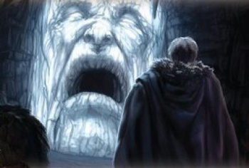 Bran Stark, Hodor, and Meera and Jojen Reed arrive at the Nightfort to go beyond the Wall. Bran, remembering Old Nan's stories, is frightened of the ruins, but Jojen reassures him it is not dangerous. Meera climbs the ice steps to look from atop the Wall.[2]