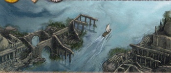 Griff, Young Griff, and their company pass Ny Sar on their way to Volantis. Tyrion Lannister sees the ruins on the eastern bank of the Rhoyne: "crooked walls and fallen towers, broken domes and rows of rotted wooden pillars, streets choked by mud and overgrown with purple moss."[2] According to Tyrion, the city is ten times as large as Ghoyan Drohe. Tyrion notices big bonesnapper turtles basking in the sun. Shortly thereafter a horned turtle of enormous size appears not six yards from the Shy Maid. Ysilla exclaims they are blessed for having seen the creature, while Yandry says it is the Old Man of the River.[2]