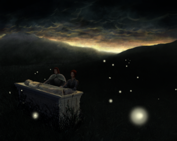 A great carved sepulcher rests in the castle yard, half-hidden in waist-high brown grass among of ash trees. The weathered sepulcher entombs Tristifer IV Mudd, King of the Rivers and the Hills. The stone is cracked and crumbling at the corners and discolored by splotches of white lichen, while wild roses creep up over the king's feet almost to his chest.[1]