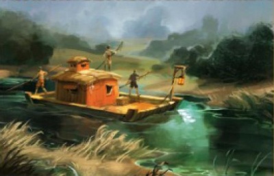 The orphan boats are pole boats. They have hardly any draft to speak of and are painted and carved. They have low roofs and wide beams. Daeron I Targaryen disparaged them as "hovels built on rafts," but that is hardly a fair assessment; all but the poorest orphan boats are wonderfully carved and painted.[1] For example, one pole boat is painted in shades of green, with a curved wooden tiller shaped like a mermaid, and fish faces peering through her rails. Poles and ropes and jars of olive oil clutter her decks, and iron lanterns swing fore and aft.[1]