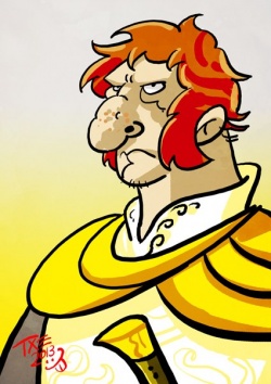 Petyr had once remarked that the horn of plenty that adorned House Merryweather's arms suited Lord Orton admirably, since he had carrot-colored hair, a nose as bulbous as a beetroot, and pease porridge for wits.[1]