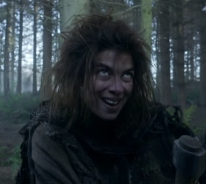 Osha travels with three other wildlings and a pair of Night's Watch deserters, Stiv and Wallen. This group flees south of the Wall, trying to escape the Others. They cross the Wall and travel into the wolfswood north of Winterfell, where they come upon the crippled Bran Stark. Osha wants to take him hostage and return to Mance Rayder, presumably to use him to gain passage south through the Wall. Robb Stark, Theon Greyjoy, Grey Wind, and Summer arrive to rescue him and all of the band are killed, except Osha. She is taken back to Winterfell for questioning.[2] She is eventually given a limited freedom of the castle for her good behavior and employed as a kitchen servant. [4]