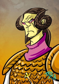 Oznak wears his hair in the shape of two ram's horns. He wears pink and white, the colors of the House of Pahl. His armor is of copper and jet scales.[1]